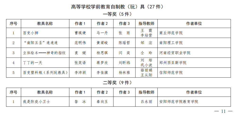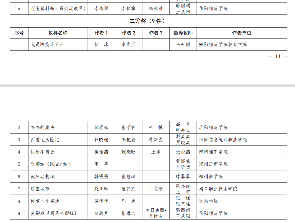 时间:2022-09-28 17:39:24 来源:太阳成集团tyc122cc 作者: 阅读: 次近日,河南省教育厅公布了第十九届河南省中小学幼儿园自制教(玩)具暨员工科技创新小制作小发明评选活动获奖名单,公司首次参赛的2件作品均获佳绩。其中,2020级学前教育本科2班李沛颖、李佳旗、杨林雅的作品《百变塑料瓶(系列玩教具)》(指导教师:骆丽娟、王从阳)获高等公司学前教育自制教(玩)具组一等奖,2020级学前教育本科1班赵越月、张琳洁、美日古丽•吾拉音的作品《皮影戏<司马光砸缸>》(指导教师:骆丽娟、王从阳)获二等奖。