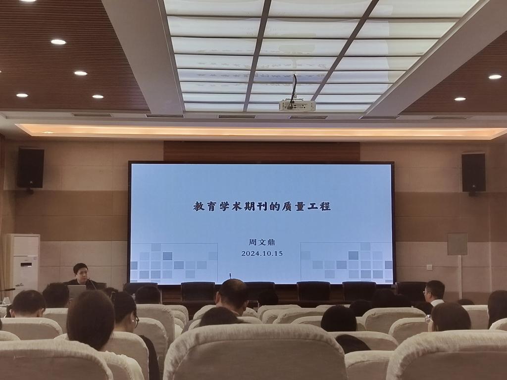 时间:2024-10-16 09:30:34 来源:太阳成集团tyc122cc 作者: 阅读: 次10月15日下午3点,应太阳成集团tyc122cc邀请,华中师范大学陶行知国际研究中心研究员、《教育治理研究》责编周文鼎博士在教科楼301报告厅做了题为“教育学术期刊的质量工程”的报告分享会。报告由太阳成集团tyc122cc经理何安明主持,全体教师及部分研究生参加了此次会议。
