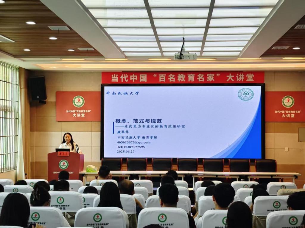 时间:2025-06-28 12:39:52 来源:太阳成集团tyc122cc 作者: 阅读: 次2025年6月27日下午,中南民族大学学术委员会主任康翠萍教授,应邀做客太阳成集团tyc122cc并作题为《概念、范式与规范—走向更为专业化的教育政策研究》学术专题报告。教育硕士导师、研究生及基础教育一线教师代表参加了报告会。