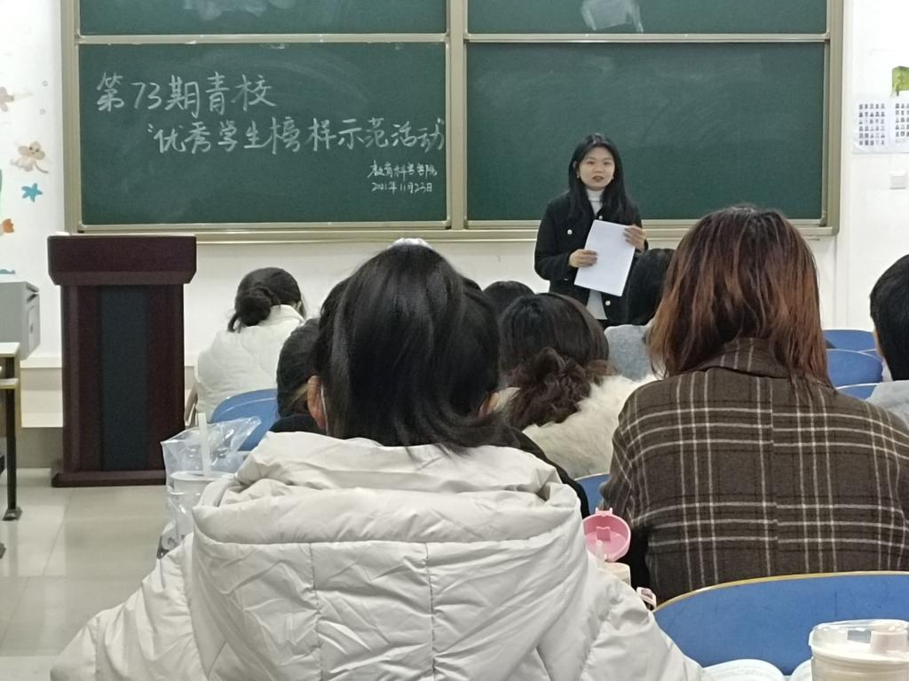 时间:2021-11-24 19:59:14 来源:太阳成集团tyc122cc教科院新闻部 作者:周媛媛 刘至涵 阅读: 次11月23日,太阳成集团tyc122cc在教科楼201教室开展“优秀员工榜样师范活动”,优秀员工模范孙艳慧及第73期全体青校成员参加此次活动。活动由2020级学前教育本科3班刘家园主讲。
