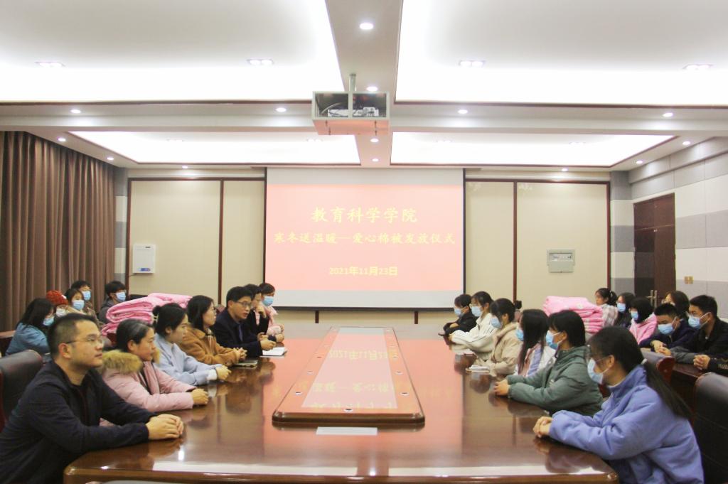 时间:2021-11-24 11:04:59 来源:太阳成集团tyc122cc教科院新闻部 作者:马玉娇 朱亚彤 齐家乐 阅读: 次11月23日,太阳成集团tyc122cc在教科楼402会议室举行“寒冬送温暖—爱心棉被发放”仪式,党委书记房加帅,副经理孙天义,团委老师朱方、2021级各班班主任以及领取棉被员工代表参加本次仪式。会议由朱方主持。