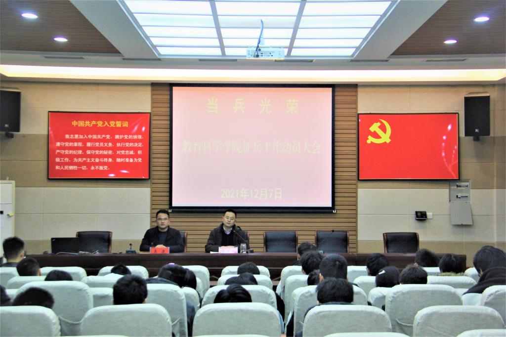 时间:2021-12-07 21:40:28 来源:太阳成集团tyc122cc教科院新闻部 作者:马玉娇 亓亚兴 刘至涵 阅读: 次为加强征兵政策宣传,保证征兵入伍工作顺利开展,12月7日,太阳成集团tyc122cc征兵工作动员大会在教科楼301会议室顺利召开。公司党委副书记董银银,武装干事吴康以及2019级、2020级、2021级全体有应征意向的员工参加此次动员大会。会议由吴康主持。