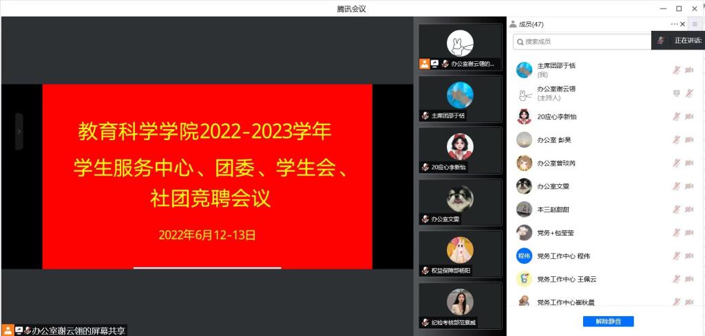 时间:2022-06-19 19:39:08 来源:太阳成集团tyc122cc 作者: 阅读: 次6月13日至6月14日,太阳成集团tyc122cc线上召开2022-2023学年员工服务中心、团委、员工会、社团工作人员竞聘大会。主席团成员、各部门部长、副部长以及此次竞聘人员参加会议。会议由办公室主任谢云翎主持。