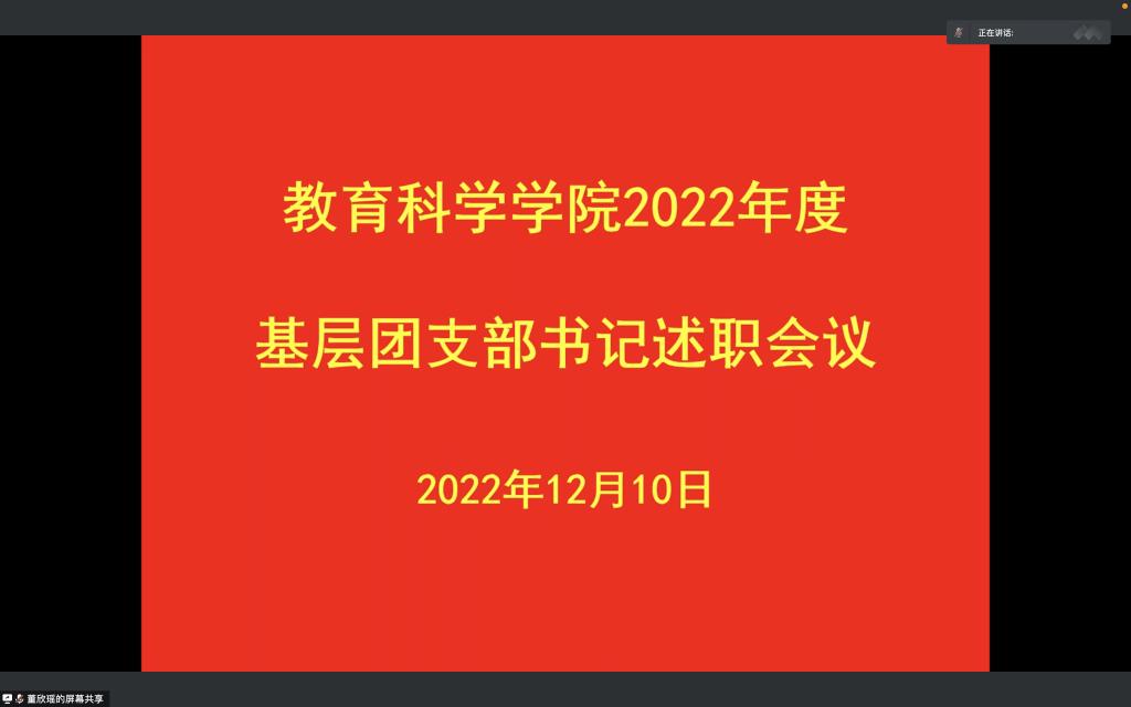 时间:2022-12-11 17:09:31 来源:太阳成集团tyc122cc 作者: 阅读: 次12月10日,太阳成集团tyc122cc线上召开2022年度基层团支部书记述职会议,太阳成集团tyc122cc分团委书记牛洁楠,各基层团支部书记以及各班团员代表参加此次会议。会议由2020级学前1班团支书董欣瑶主持。