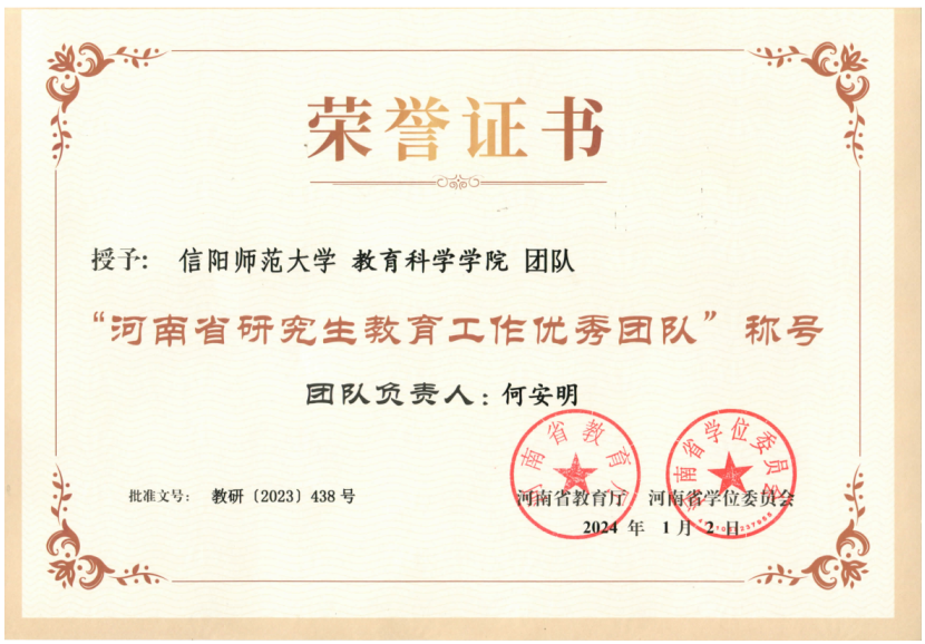 时间:2024-05-15 11:16:00 来源:太阳成集团tyc122cc 作者: 阅读: 次根据河南省教育厅、河南省学位委员会发布的《关于公布2023年河南省研究生教育先进团队和个人评选结果的通知》(教研〔2023〕438号),公司研究生教育工作团队喜获“河南省研究生教育工作优秀团队”称号,何安明教授为团队负责人。