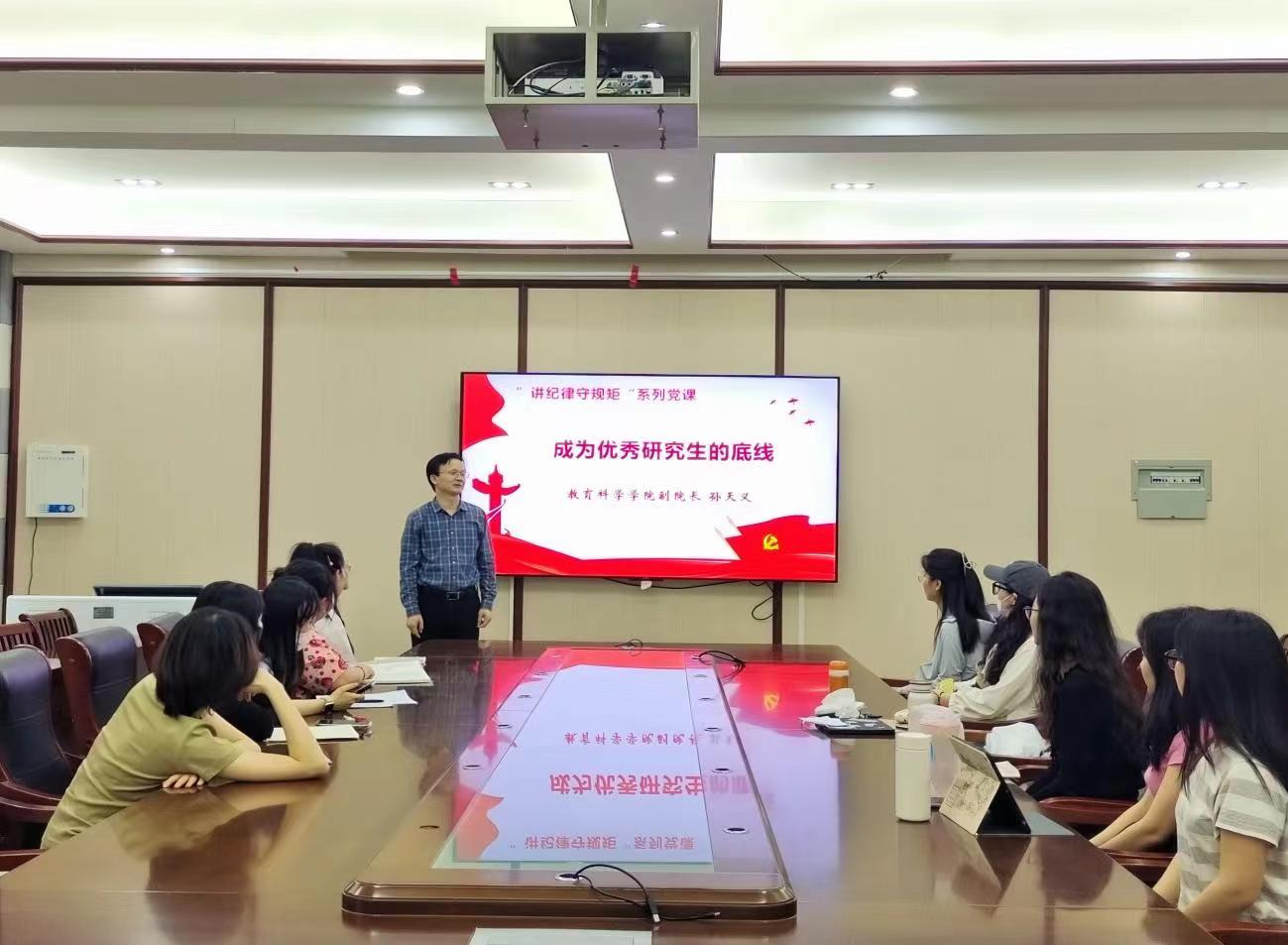 太阳成集团tyc122cc副经理孙天义以《成为优秀研究生的底线》为题,结合负面清单和典型案例,强调研究生党员要增强党性修养、保持优良党风、严守党的纪律、推进自我革命,处理好公与私、义与利、纪与情、道与术的关系,明大德、守公德、严私德、传美德,模范遵守法律法规、校规校纪、科研伦理和学术道德。