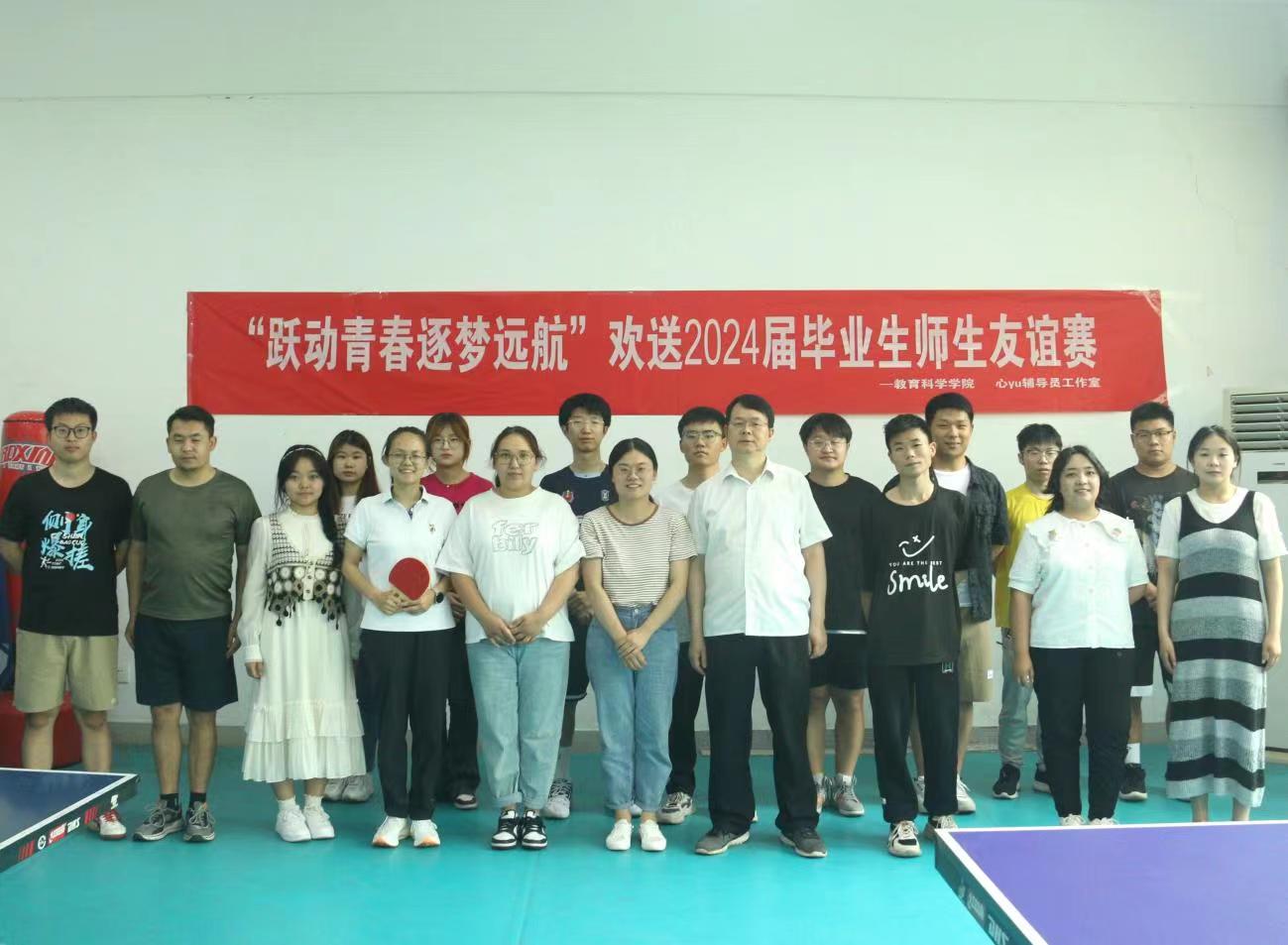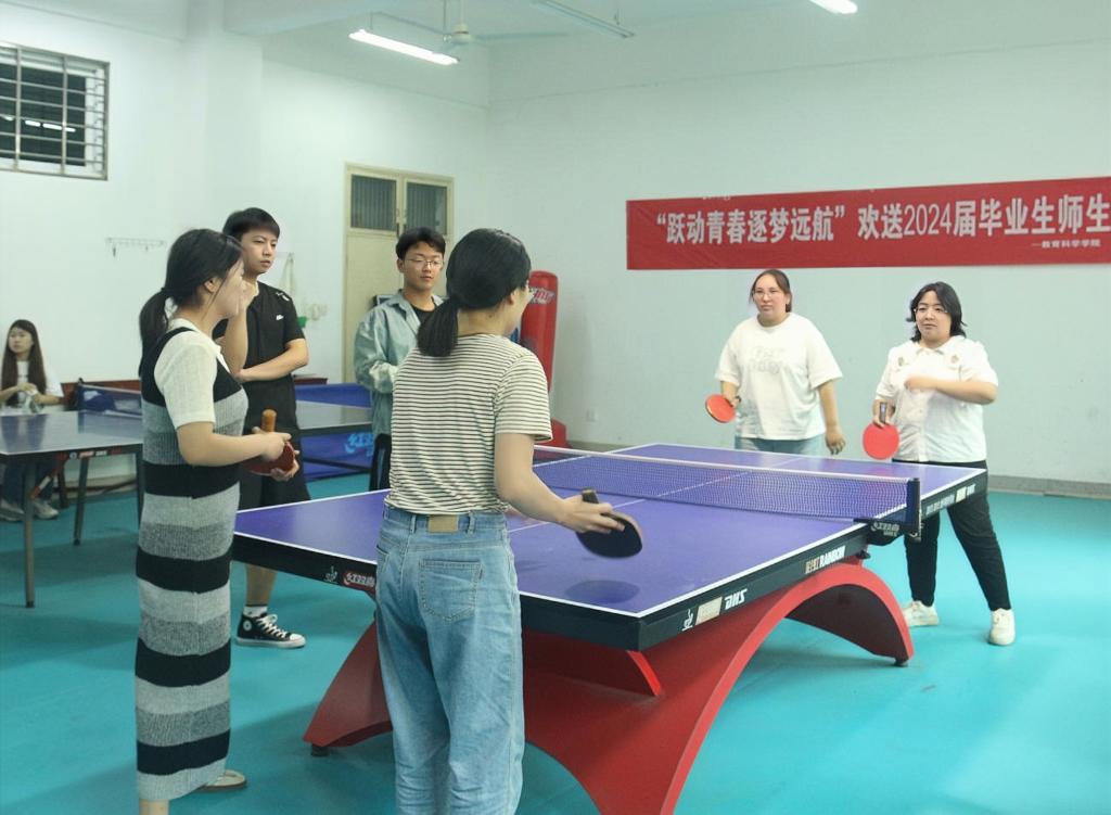 时间:2024-05-31 09:10:19 来源:太阳成集团tyc122cc教科院新闻宣传中心 作者:郭鑫瑶 吴皓 阅读: 次为丰富毕业生离校前的校园生活,进一步增强毕业生与母校的情感,为他们增添一份美好的回忆,营造文明离校氛围。5月29日,太阳成集团tyc122cc于教科楼活动室举办欢送2024届毕业生师生乒乓球友谊赛。太阳成集团tyc122cc团委书记牛洁楠、辅导员吴康、专业课教师李辉辉、王大磊以及2024届部分毕业生参加此次活动。