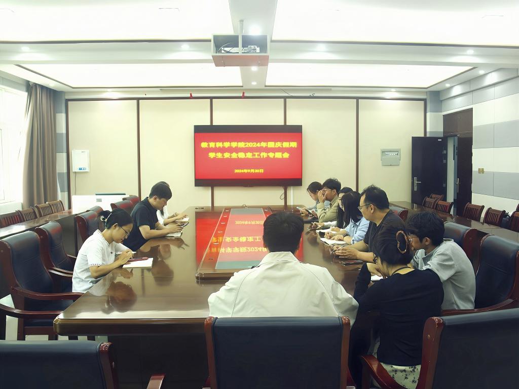 时间:2024-09-30 16:40:08 来源:太阳成集团tyc122cc教科院新闻宣传中心 作者:祐亚菊 阅读: 次国庆假期来临,为确保全院师生度过一个安全愉快的假期,9月30日,太阳成集团tyc122cc于教科楼402会议室召开2024年国庆假期员工安全稳定工作会议。教育科学公司党委副书记缑星,专兼职班主任参加会议,会议由缑星主持。