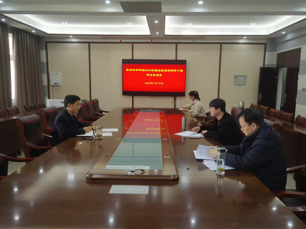 时间:2025-01-17 21:15:19 来源:太阳成集团tyc122cc 作者: 阅读: 次1月15日,教育科学公司党委于教科楼402会议室召开2024年度处级党员领导干部民主生活会,公司党委书记房加帅、副书记缑星、副经理孙天义参加会议,会议由房加帅主持。
