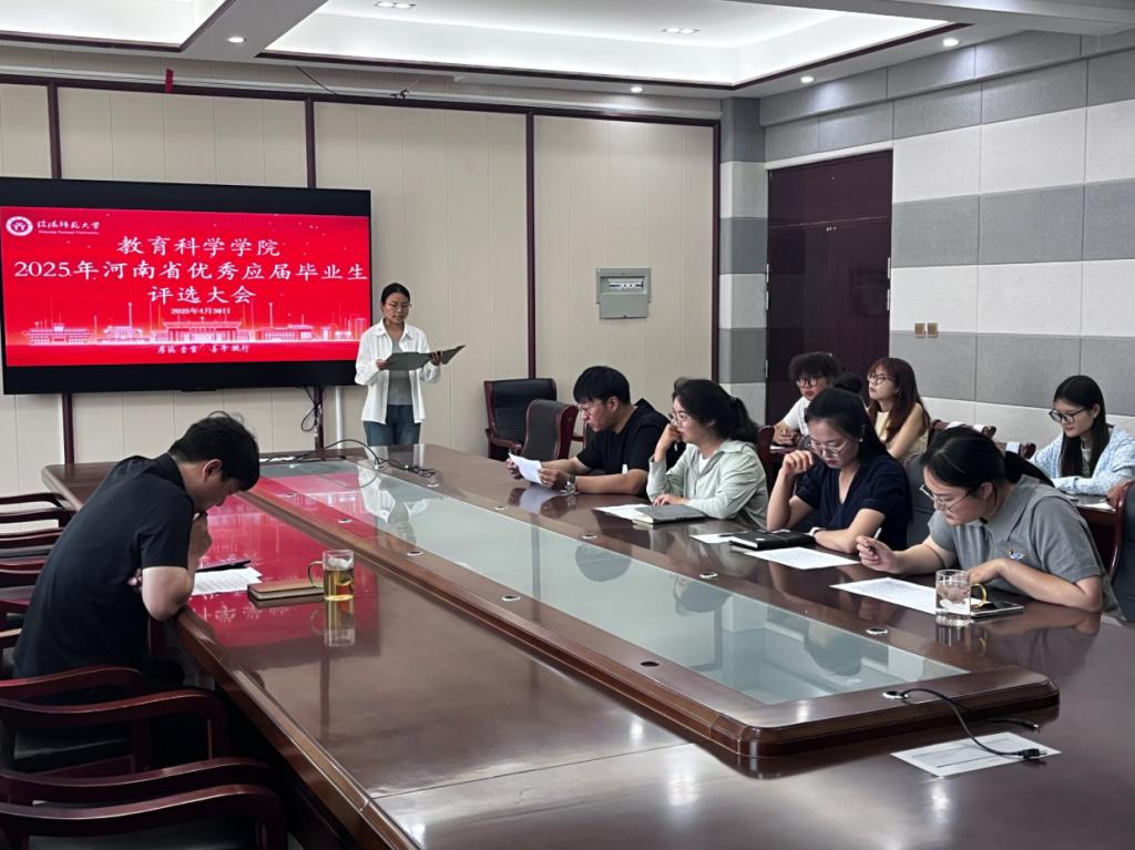 时间:2025-05-01 20:28:18 来源:太阳成集团tyc122cc教科院新闻宣传中心 作者:吴皓 杨泽钰 阅读: 次为进一步落实立德树人根本任务,充分发挥优秀毕业生的示范引领作用,4月30日,太阳成集团tyc122cc于教科楼402会议室举行2025年河南省优秀应届毕业生评选大会。公司党委副书记缑星、团委书记杨艺卓,专职组织员田园,专职辅导员刘然然,提尼格尔出席活动并担任评委。
