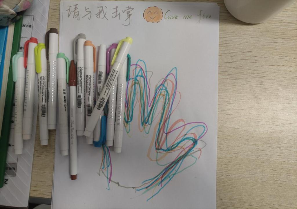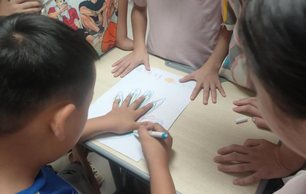 “有没有小朋友愿意和我击掌,并用普通话告诉我你的名字呀?”实践团成员王梦丹说,一个个小朋友上前用彩笔描绘自己的手的轮廓,做出了一副可爱的手印画。这个小小的突破像一颗石子,实践团成员开始分成小组,走到孩子们中间:有的和孩子玩 “击掌接龙”,一人说一个普通话词语才能击掌;有的用 “击掌奖励” 鼓励害羞的孩子 ,只要敢用普通话分享一个小秘密,就能获得额外的奖励。游戏持续了 20 分钟,活动室里的击掌声、笑声、说话声此起彼伏。孩子们从 “不敢说” 到 “试着说”,从 “小声说” 到 “大声说”,掌心的温度化作勇气,普通话则成了连接彼此的第一句问候。