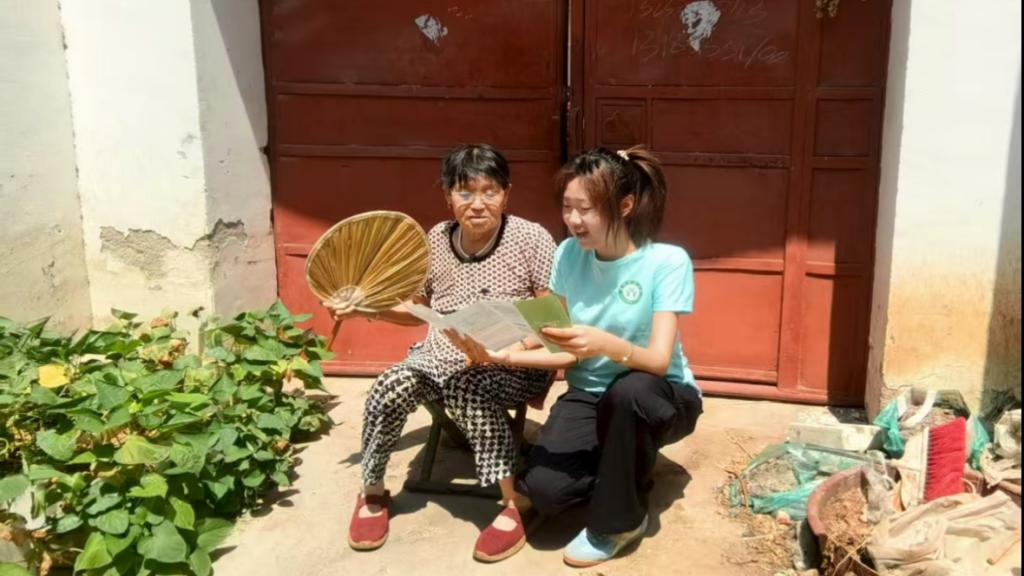 走进村民家中,与王大娘聊聊普通话,在唠家常中让村民认识到推普的重要性,同时了解村民的日常生活中普通话使用难处。田埂上的劳作间隙,也成了最热闹的推普课堂。李大叔拿着农药说明书犯愁,队员凑过去用普通话逐句念:“这款农药稀释比例是1比500,喷洒时要避开正午高温。”念完又用方言再解释一遍,还教李大叔念“稀释”“比例”这些关键词。“原来这么念!之前跟技术员打电话,俺说‘兑稀点’,人家半天没懂啥意思!”李大叔摸着后脑勺笑,跟着队员一遍遍练习。