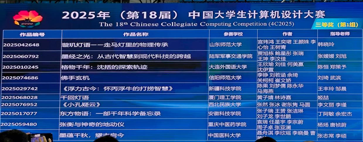 继省赛中三组作品入围,刘琦、张立春老师指导的《贞明鉴:清灯下的光学之旅》、宋晔、张立春老师指导的《逐点连波:正余弦函数成像》获国赛二等奖,刘琦、武滨老师指导的《佛手玄机》获国赛三等奖。