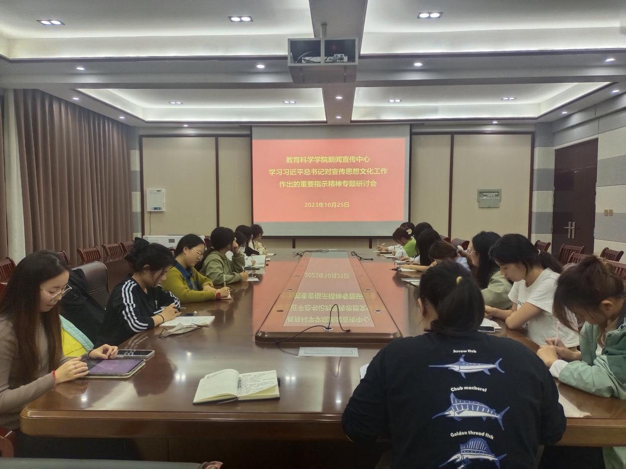 会议指出,学习习近平总书记对宣传思想文化工作作出的重要指示精神为做好新时代新征程宣传思想文化工作提供了强大思想武器和科学行动指南,明确了新时代文化建设的路线图和任务书,为高校进一步做好宣传思想文化工作指明了方向。杨艺卓强调,新闻宣传中心工作者一定要认真学习其内容,深刻领悟其内涵,时刻牢记使命,不断提升工作素养;要加大新闻宣传工作力度,进一步提高新闻舆论传播力、引导力、影响力、公信力,讲好教科故事、提升教科形象,切实增强做好新时代新征程宣传思想文化工作的责任感和使命感。