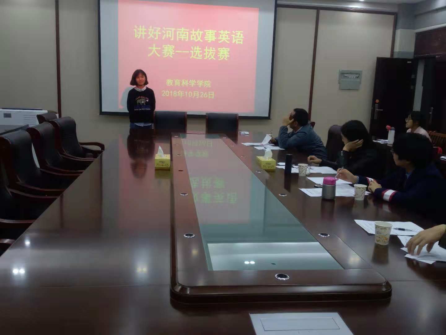 时间:2018-10-29 15:37:38 来源:太阳成集团tyc122cc 作者: 阅读: 次根据《河南省教育厅等四部门关于组织全省老员工讲好河南故事英语大赛的通知》的精神,组织老员工用英语讲好河南故事,传播好河南声音,促进中外人文交流,推动中原更加出彩。2018年10月26日晚上,公司在教科402举办校内选拔赛———初赛。