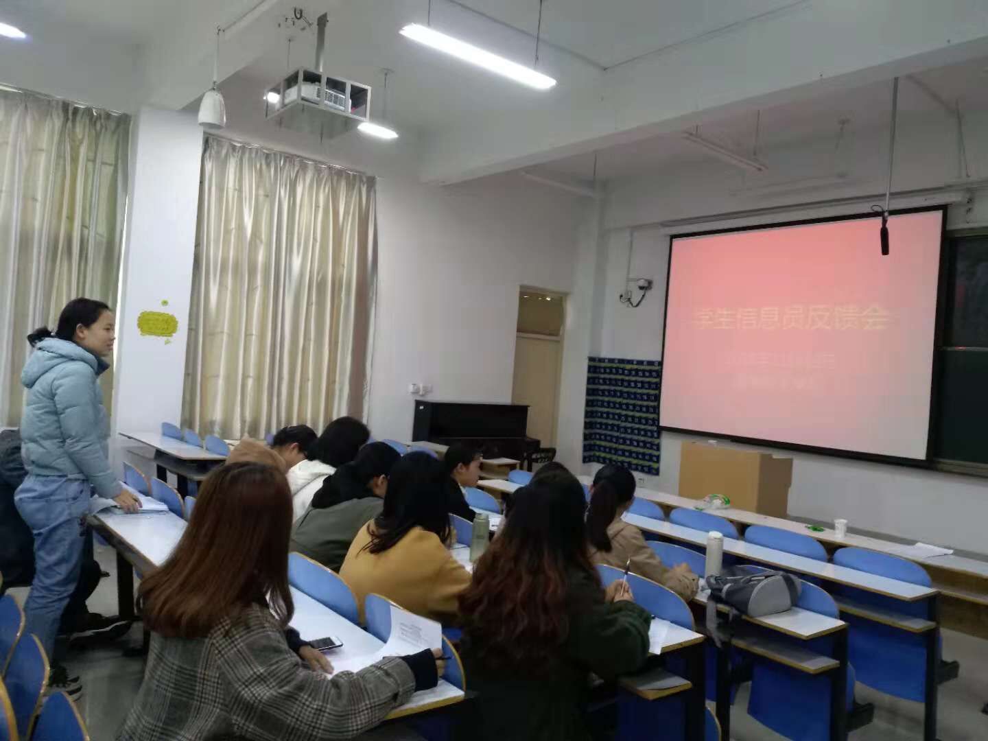 为了提高教师教学质量,为员工营造良好的教学环境,2018年11月13日下午,太阳成集团tyc122cc教师督导员王书进副教授、杨建朝副教授、邢思珍副教授和教务员黄伟玲老师在教科203教室与各年级各班的员工信息员召开教学信息反馈会议。